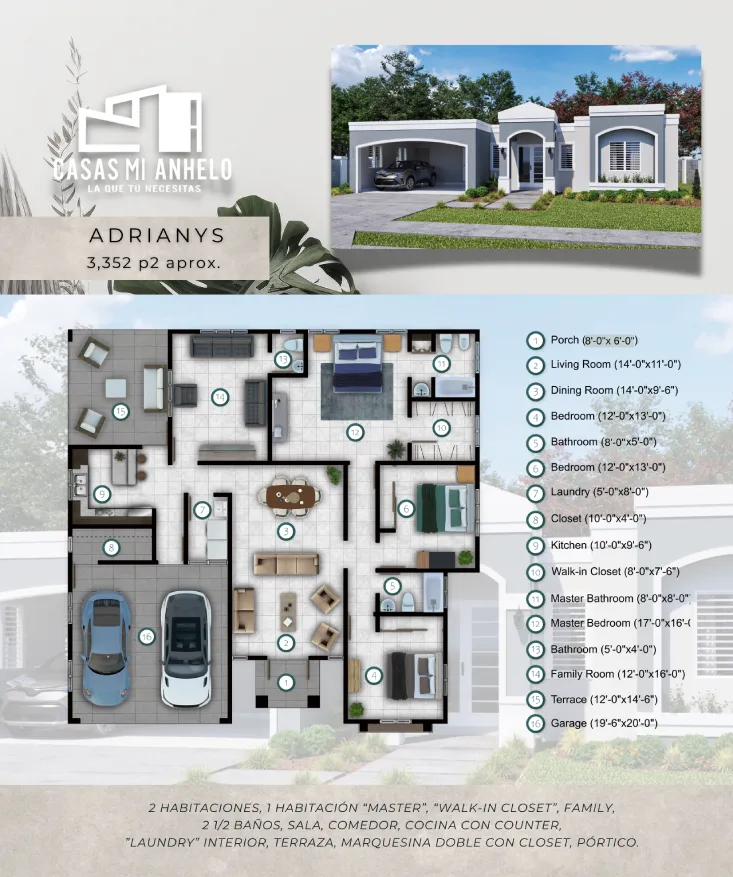 3 Habitaciones, 1 «Walk-in Closet», 2½ Baños, Sala, Comedor, Cocina con Counter, «Family», «Laundry», Terraza, Marquesina Doble.