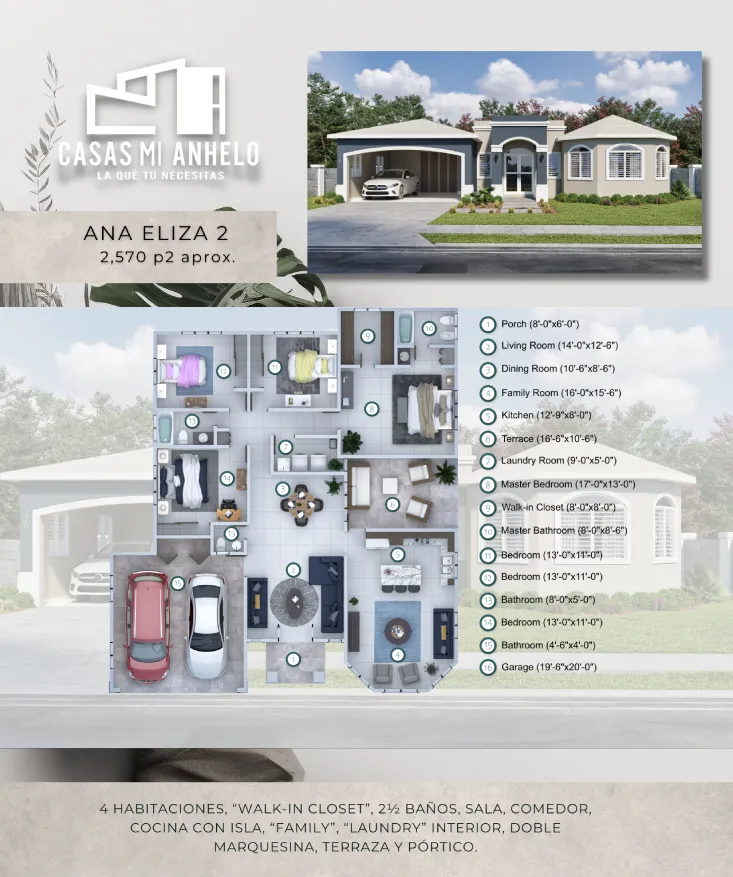 4 Habitaciones, «Walk-in Closet», 2½ Baños, Sala, Comedor, Cocina con Isla, «Family», «Laundry» interior, Doble Marquesina, Terraza y Pórtico.