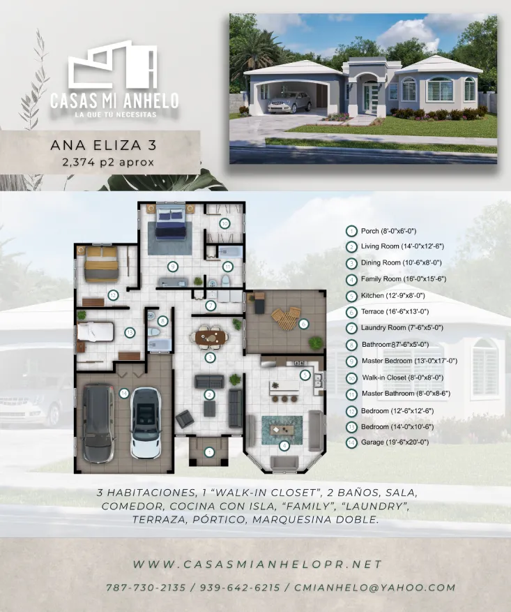 3 Habitaciones, 1 «Walk-in Closet», 2 Baños, Sala, Comedor, Cocina con Isla, «Family», «Laundry», Terraza, Pórtico, Marquesina Doble.