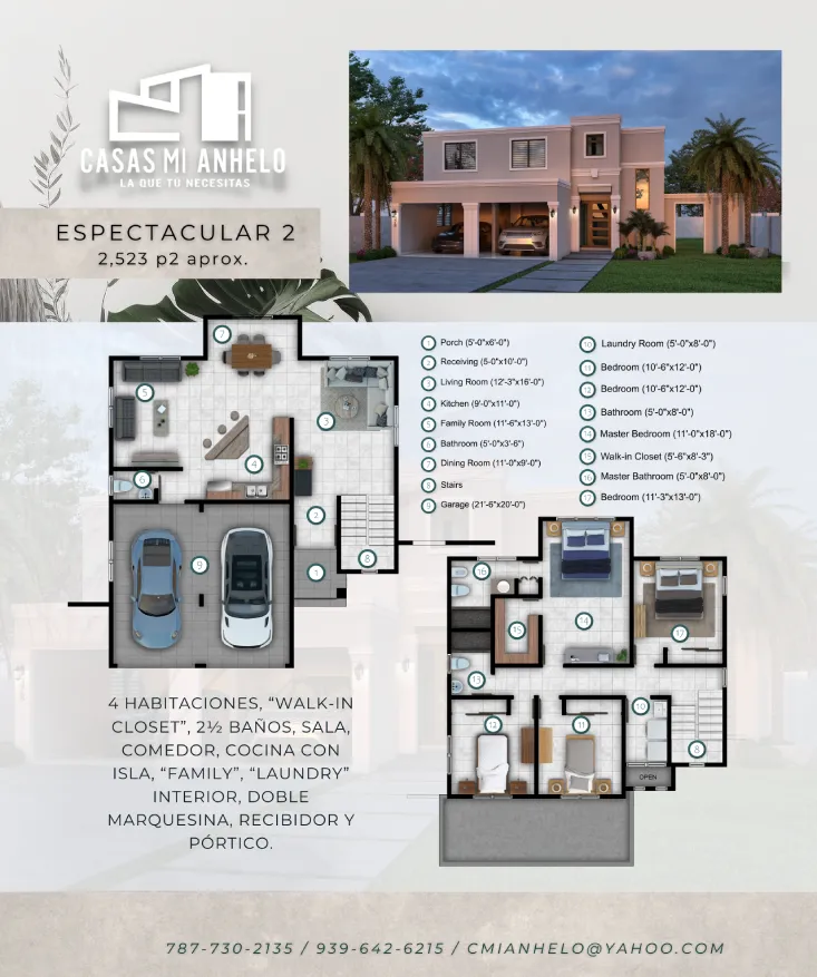 4 Habitaciones, «Walk-in Closet», 2½ Baños, Sala, Comedor, Cocina con Isla, «Family», «Laundry» interior, Doble Marquesina, Recibidor y Pórtico.