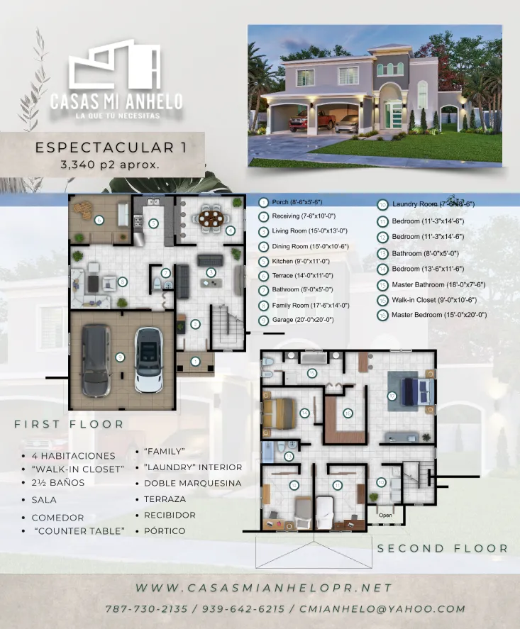 4 Habitaciones, «Walk-in Closet», 2½ Baños, Sala, Comedor, Cocina con «Counter», «Family», «Laundry» interior, Doble Marquesina, Terraza, Recibidor y Pórtico.