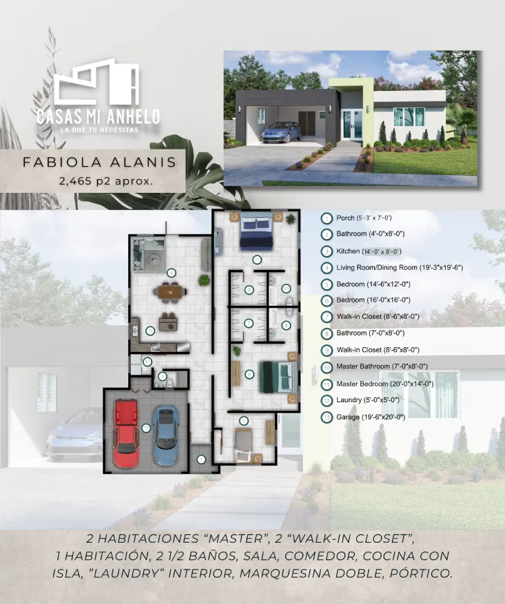 2 habitaciones master, 1 habitacion, 2.5 baños, «open concept», sala, cocina, comedor, 2 walk-in-closet, laundry, marquesina doble.
