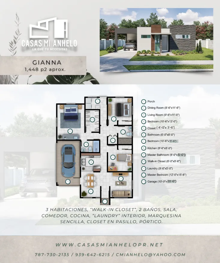 3 habitaciones, 2 baños, walk-in-closet, laundry, sala, cocina, comedor, marquesina sencilla.