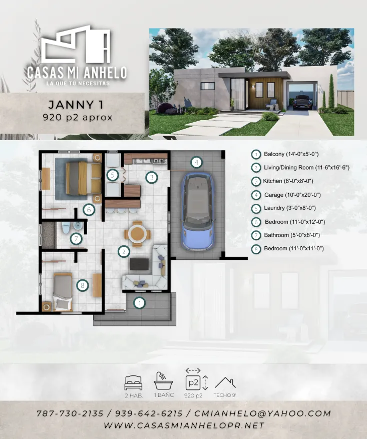 2 Habitaciones, 1 Baño, Sala, Comedor, Cocina, «Laundry» interior, Marquesina sencilla y Balcón.