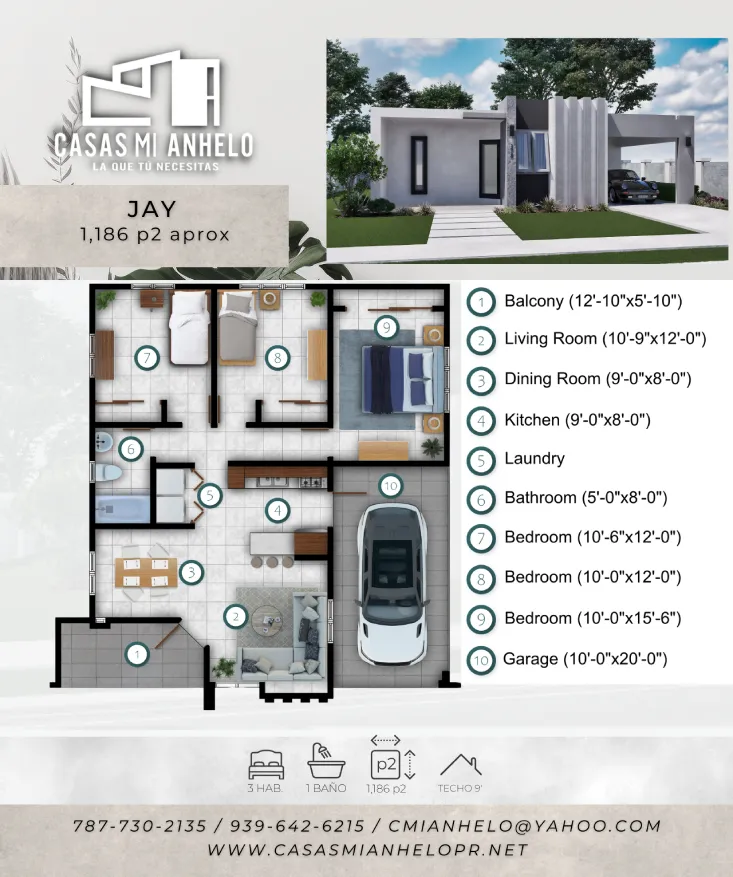 3 Habitaciones, 1 Baño, Sala, Comedor, Cocina con «Counter», «Laundry» interior, Marquesina sencilla y Balcón.