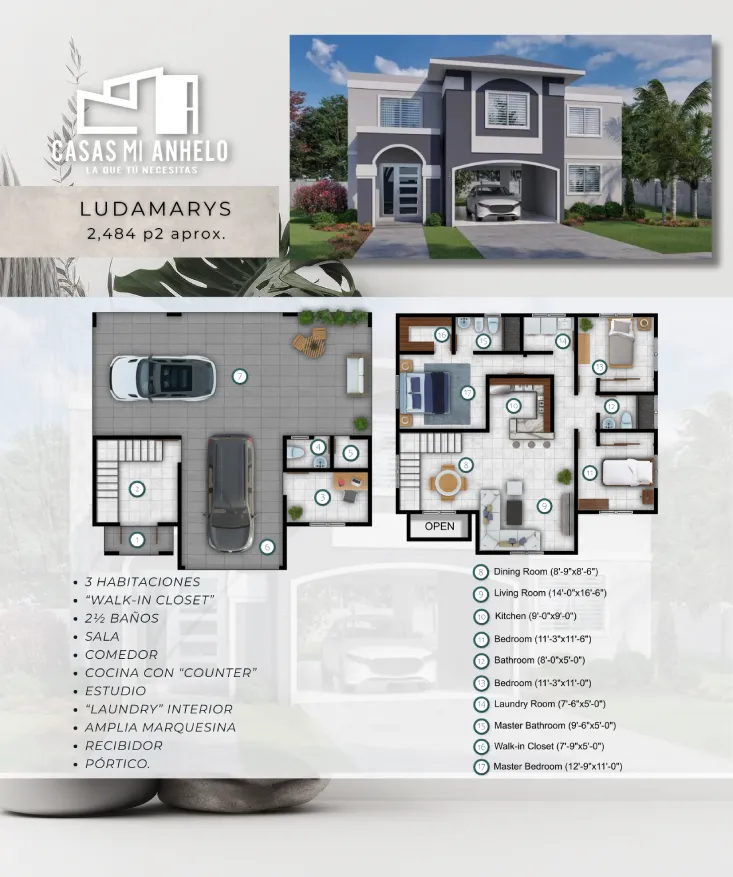 3 Habitaciones, «Walk-in Closet», 2½ Baños, Sala, Comedor, Cocina con «Counter», «Family», «Laundry» interior, Amplia Marquesina, Recibidor y Pórtico.