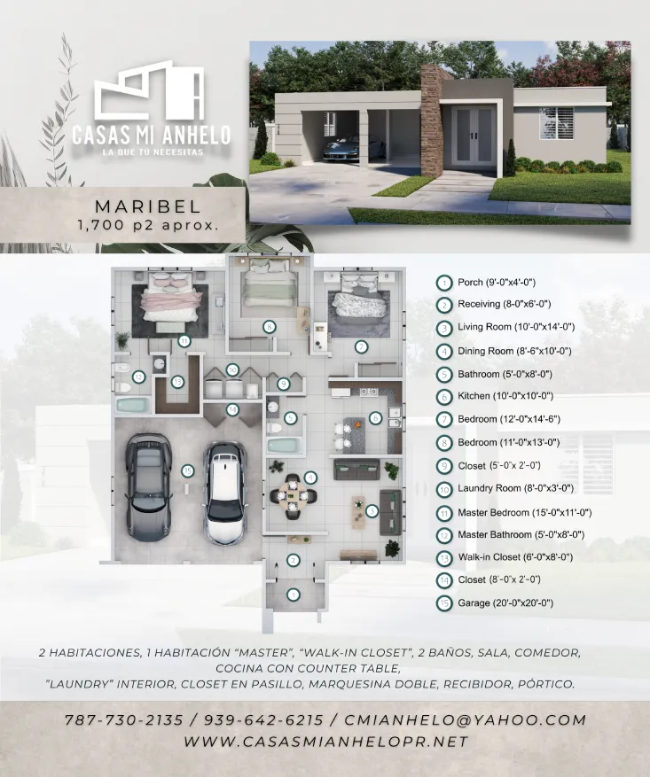 3 Habitaciones, «Walk-in Closet», 2 Baños, Sala, Comedor, Cocina con «Counter», «Laundry» interior, Doble Marquesina, Recibidor y Pórtico.