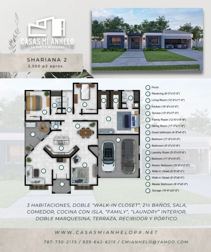 3 Habitaciones, Doble «Walk-in Closet», 2½ Baños, Sala, Comedor, Cocina con Isla, «Family», «Laundry» interior, Doble Marquesina, Terraza, Recibidor y Pórtico.