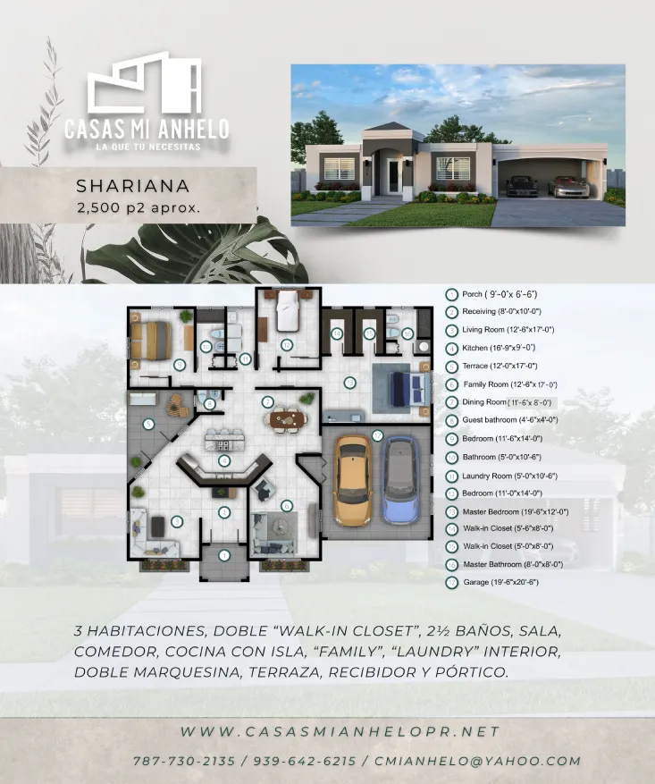 3 Habitaciones, Doble «Walk-in Closet», 2½ Baños, Sala, Comedor, Cocina con Isla, «Family», «Laundry» interior, Doble Marquesina, Terraza, Recibidor y Pórtico.