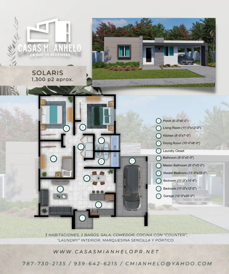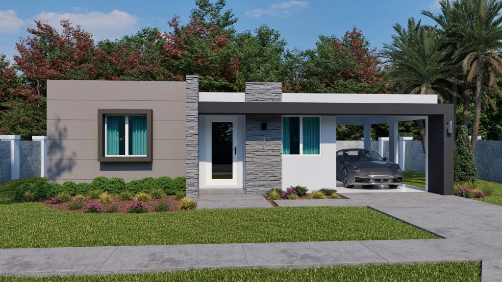 3 Habitaciones, 2 Baños, Sala, Comedor, Cocina con «Counter», «Laundry» interior, Marquesina sencilla y Pórtico.